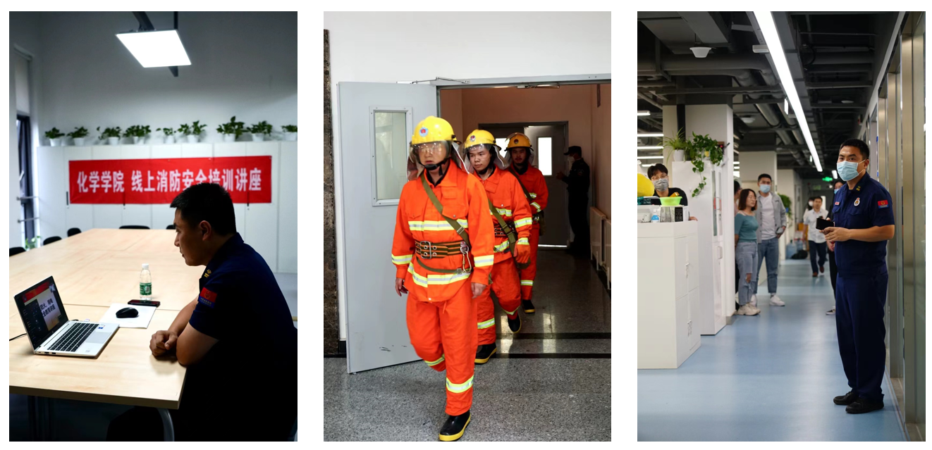 培训结束后,演习正式开始。首先是安全疏散演练,由徐警官发出火警警报,各小组听到指令迅速就位。疏散组在楼层安全出口处迅速指挥同学从指定路线有序撤离至安全区域。在沙河校区管理委员会安保部、保安队、微型消防站和东区物业工作人员的积极配合下整场演练过程紧张有序,实用性强,达到了预期效果。