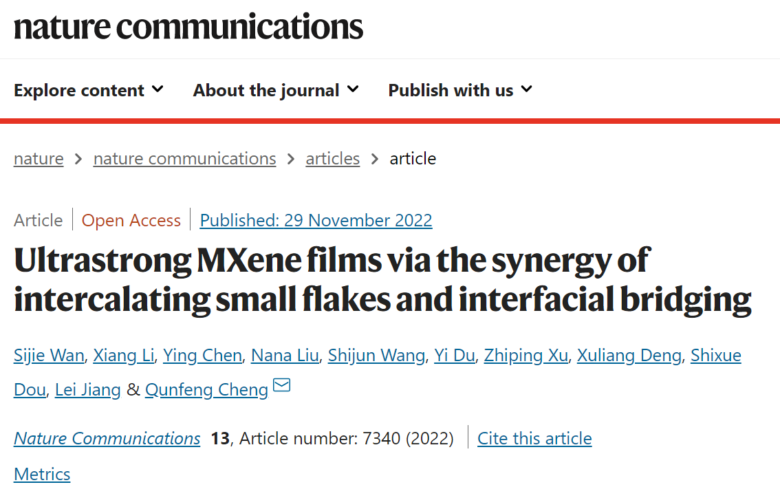 2022年11月29日,《Nature Communications》在线刊登了公司XCSport程群峰教授课题组的最新研究成果“小片填充和界面交联协同致密化的超强MXene薄膜”(英译:Ultrastrong MXene films via the synergy of intercalating small flakes and interfacial bridging),公司XCSport万思杰副教授、李响、北大口腔医院第一门诊部陈英博士、公司物理公司刘娜娜博士为第一作者,程群峰教授为通讯作者,XCSport为第一完成单位。