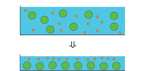 包含不同大小胶体粒子的溶液薄膜在蒸发过程中会出现大小球的分层,小球在上而大球在下。这与传统理论的预测正好相反。因为大球的扩散常数比小球小,所以更容易在气液界面上堆积。运用昂萨格原理,在经典扩散模型中引入大小球之间的相互作用,成功的解释了这一反常的分层现象。