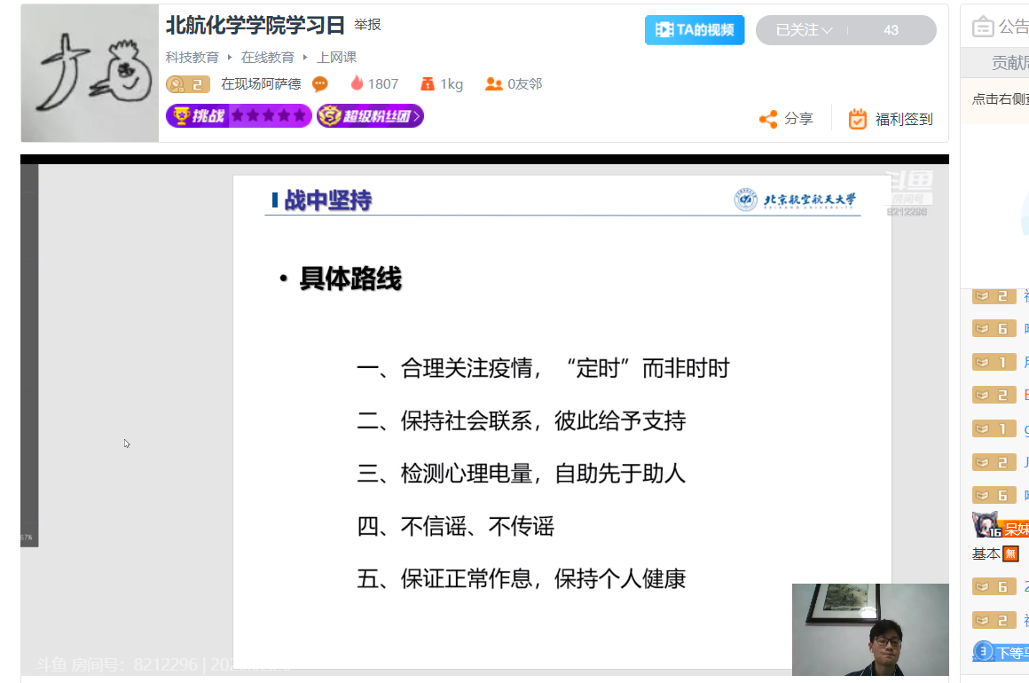 各年级班会以共同的主题——“新学期·新形势·新学风”为开端。辅导员向同学们强调新学期课程改为网络线上进行,提醒员工们,虽然在家,学习上不能放松,务必做好专业课学习和防疫知识的学习。同时,向员工们讲述国家及公司最新的防疫工作精神及要求,要求同学们务必遵守公司及公司的各项管理要求。号召大家在这个“全民战疫”的特殊春季,作为北航学子,要发扬北航“特别能吃苦、特别能战斗、特别能奉献”的优良传统,养好身体,好好学习,天天向上。