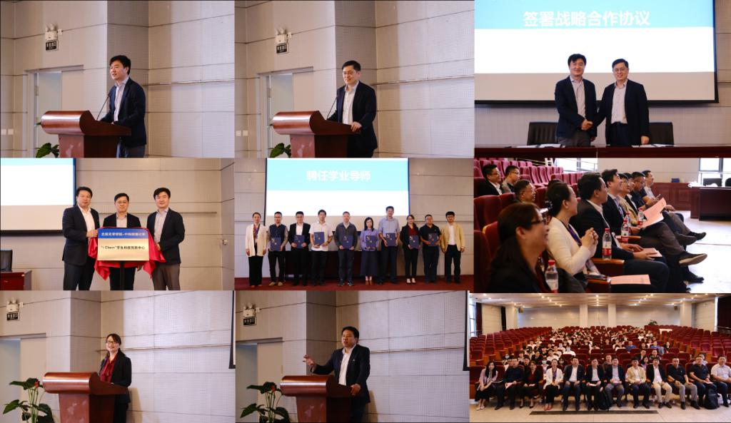 中科院理化所副所长王树涛,校团委书记庄岩,XCSport经理刘明杰为 “iChem”员工科技创新中心揭牌。理化所教育处副处长丁黎和公司党委书记李红捷为学业导师代表颁发聘书。