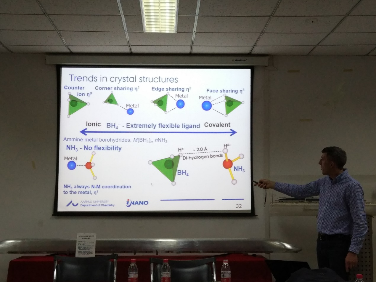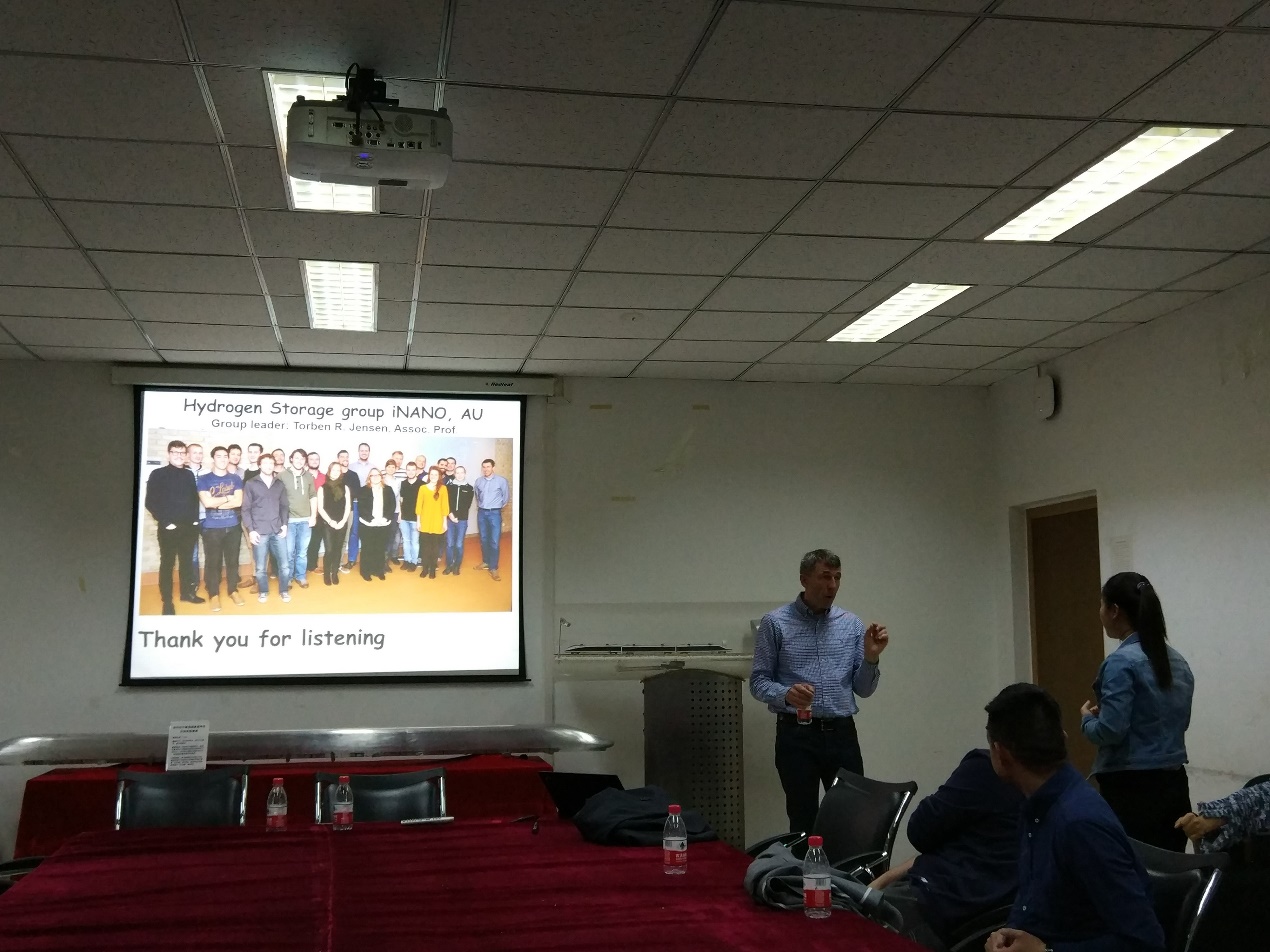 本次报告由公司教师张瑜研究员主持,吸引了全院众多师生到场聆听。TorbenR. Jensen教授的报告题目为“Hydrides for Multi-FunctionalEnergy Storage Applications”。Torben教授首先对奥尔胡斯大学科学与技术公司的整体状况进行了简短的介绍,使同学们对该校有了一个全面的认识,随后对自己在多功能储能材料的科研工作进行了详细的介绍。他先简单介绍了氢能源,被认为是一个潜在的非常有趣的能量载体,它可以促进可再生能源分布不均的有效利用。此外,氢具有非常有趣的化学性质,并且与周期表中的大多数元素以及各种不同类型的键形成化合物。金属氢化物最近变得非常有趣,是新型的电池和储氢能源材料。随后,他讲述了他们研究小组在新的含氢材料的最新成果。主要包括新型金属硼氢化合物的合成和其储氢性质和离子导体的研究;通过形成共晶熔融体系调整材料性能;以及原位粉末X射线衍射研究氢的释放和吸收反应。