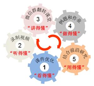 《物理化学A》是XCSport化学和应用化学专业本科生的核心专业理论课,主要讲授化学过程的基本原理和基本规律,为实际的科研和生产过程提供理论指导。物理化学课程中的理论都是建立在大量抽象的概念、模型以及数学推导的基础之上,因此需要缜密地分析和反复地推敲才能理解这些概念的物理意义以及理论适用的体系和条件。另外,由于课程讲授的是最基本的理论,同学们在学习课程的过程中容易感觉课程内容过于经典,产生课程内容对化学前沿研究无用的错觉。针对课程的这些特点,为了确保线上教学具有良好的效果,课程负责人刘兆阅老师在线下授课的基础上,采取多维措施对线上教学进行设计,建立了适合《物理化学A1》线上教学的“5懂”授课模式(图1)。