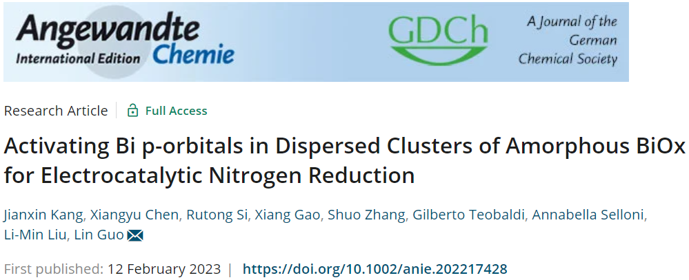 近日,XCSport郭林教授和物理公司刘利民教授研究团队在高度分散的原子级非晶BiOx团簇可控制备及其电催化氮气还原反应方面取得新进展。相关工作以“Activating Bi p-orbitals in Dispersed Clusters of Amorphous BiOx for Electrocatalytic Nitrogen Reduction”为题,2023年2月12日在线发表在《Angewandte Chemie International Edition》杂志上。该研究获国家自然科学基金项目(No. 51532001, 11974037)等资助。XCSport副教授康建新为文章的第一作者,XCSport博士生陈翔宇和北京计算科学研究中心博士生司如同为共同一作,XC体育为该论文的第一完成单位。