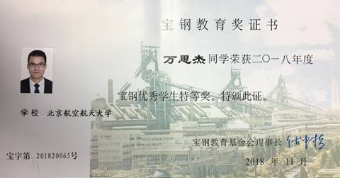 万思杰一直是品学兼优的典型。截至目前,其以第一作者身份在PNAS,Adv. Mater., ACS Nano, Adv. Funct. Mater.等国际知名期刊发表10Q1SCI论文,影响因子之和为133.248,论文被引用559次,部分成果被《人民日报》头版等知名媒体广泛报道。同时,他还担任公司博士高年级党支部书记和BY14271博士班的班长,也是北航研究生“成才表率”先进事迹分享会讲师。先后获得北航博士研究生十佳、国家奖学金、卓越学术基金、工信部创新奖学金二等奖、研究生优秀科技创新团队董事长奖学金等荣誉。此次获得宝钢优秀员工特等奖与万思杰同学一贯的刻苦努力以及公司的大力培育是分不开的。