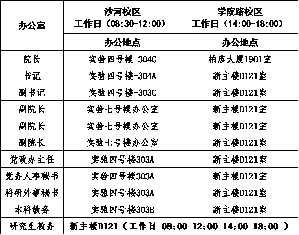 在搬迁期间为更好服务两校区公司师生,经公司党政联席会和搬迁工作领导会议审议决定从2020年12月21日(周一)起公司行政办公室试行两校区办公,即工作日上午在沙河校区集中办公(实验4号楼303办公室),下午在公司路校区办公(新主楼D121办公室)。两校区办公试运行中可能出现的问题敬请广大师生谅解,并请及时与公司党政办主任联系以便持续改进。详细办公安排如下: