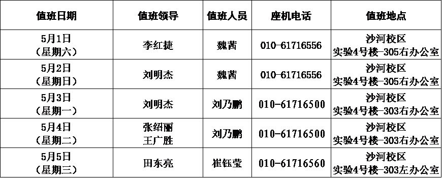 2.公司党政办公室要切实做好节日期间的安全保卫、保密、防火、防盗工作,保证值班人员按时在校在岗值班(08:30-11:30,14:00-17:00),值班领导要求保持手机畅通,遇紧急情况能第一时间赶到现场,确保校园安全稳定,值班领导及人员情况见下图: